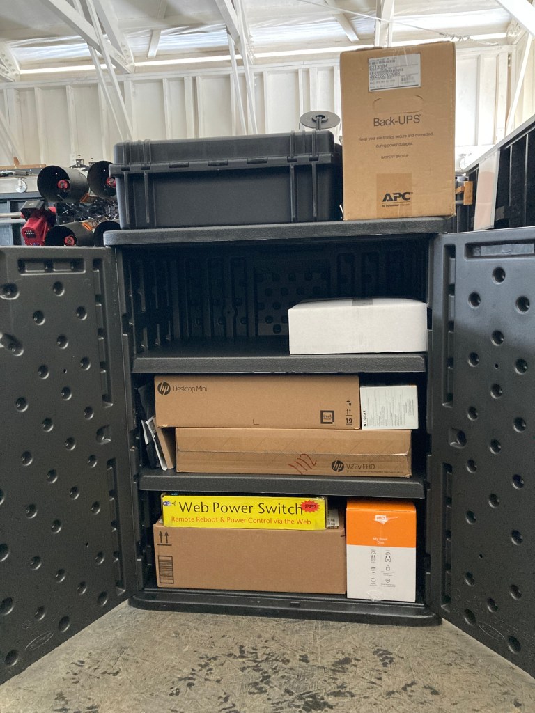 Our workstation is not setup yet, but this picture contains all of the equipment that will go into it. The core of the system is an HP Desktop Mini, a backup UPS, and an external storage enclosure.